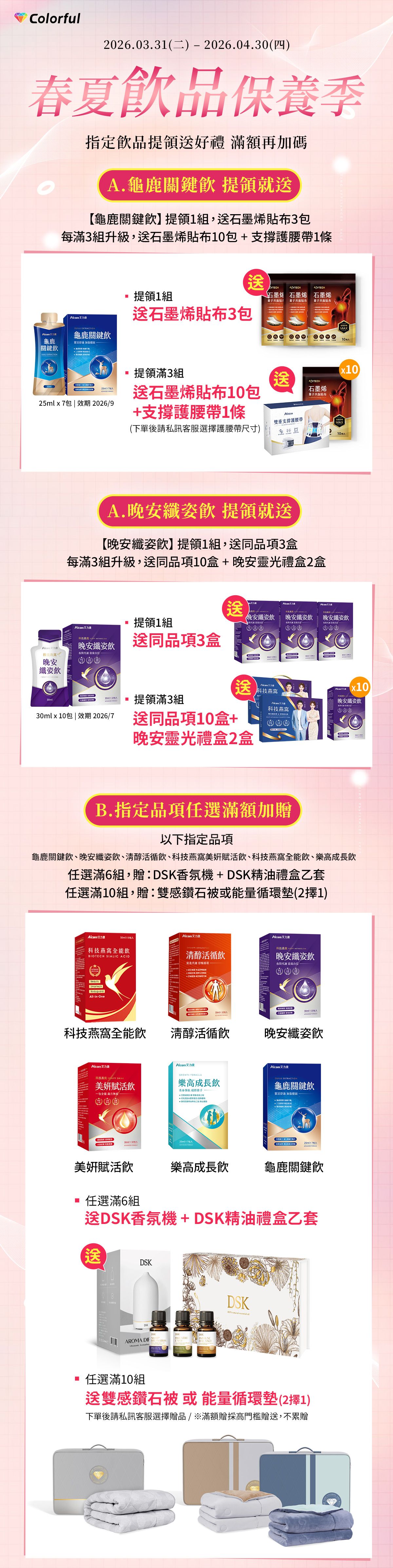 ▪ 任選滿10組,贈:雙感鑽石被或能量循環墊(2擇1)